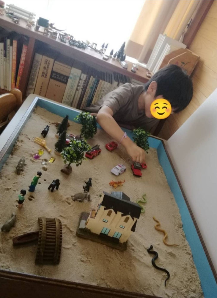 上の写真は、箱庭あそびをしているAくん(5才、年長)の様子です。楽しんでいる様子が見えるのではないでしょうか。